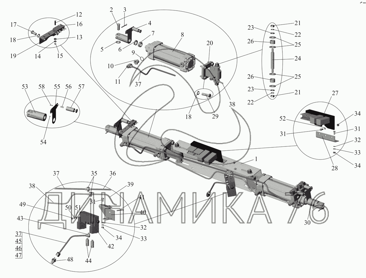 Перечень комплектующих от Привод дверей с одним распределителем на МАЗ-105 (2011)