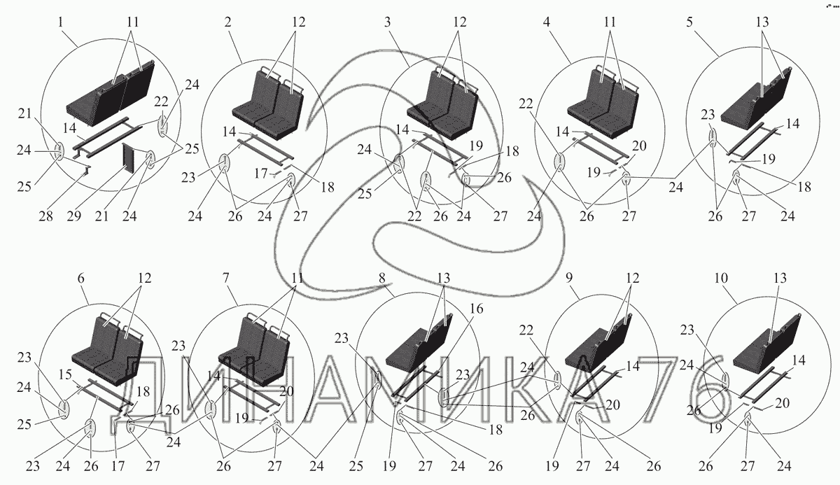 Схемы запчастей предназначены для справочных целей! Мы продаем не все запчасти от Сиденья двухместные на МАЗ-105 (2011), представленные в этом списке.