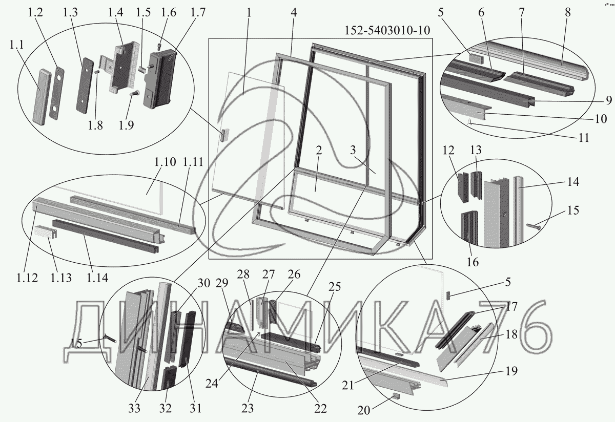 Перечень комплектующих от Окно водителя 152-5403010-10 на МАЗ-152 (2011)