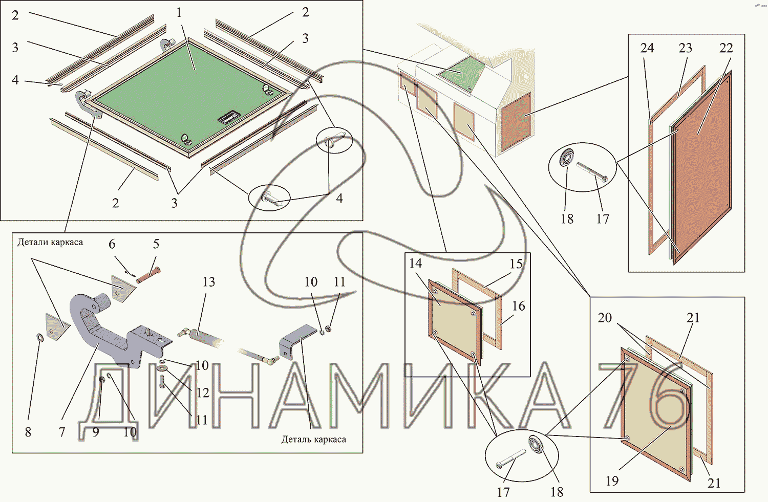 Перечень комплектующих от Крышка люка моторного отсека на МАЗ-215
