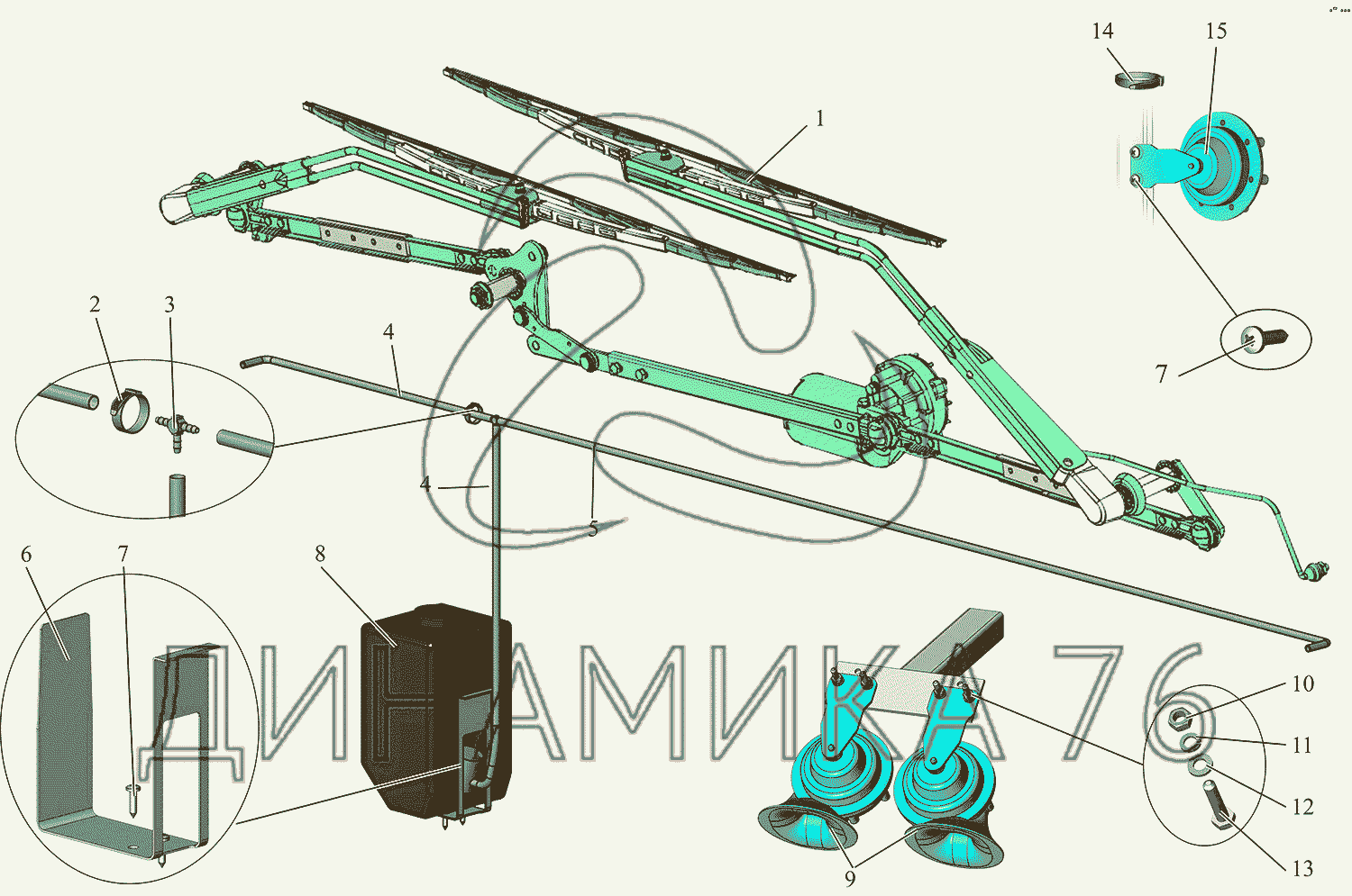 Перечень комплектующих от Установка стеклоочистителя, стеклоомывателя и звуковых сигналов на МАЗ-215
