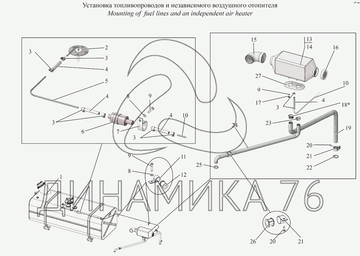 Перечень комплектующих от Установка топливопроводов и независимого воздушного отопителя на МАЗ-231