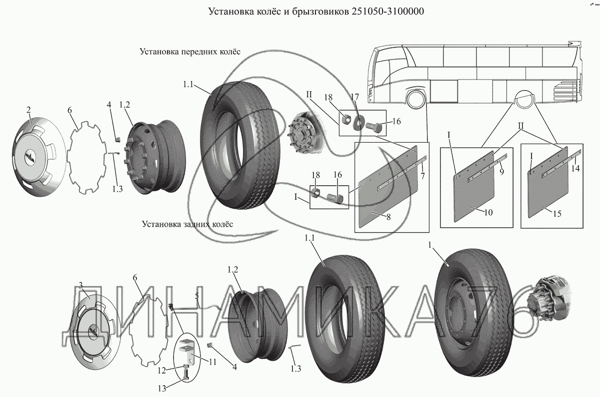 Схемы запчастей предназначены для справочных целей! Мы продаем не все запчасти от Установка колес и брызговиков 251050-3100000 на МАЗ-251, представленные в этом списке.