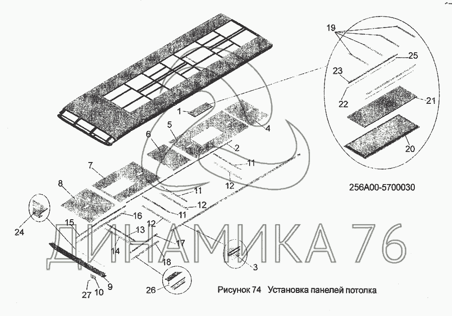 Перечень комплектующих от Установка панелей потолка 256 А00-5700030 на МАЗ-256