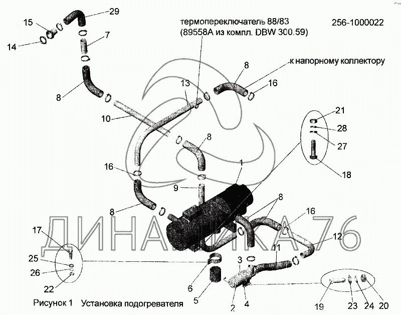 Перечень комплектующих от Установка подогревателя 256-1000022 на МАЗ-256