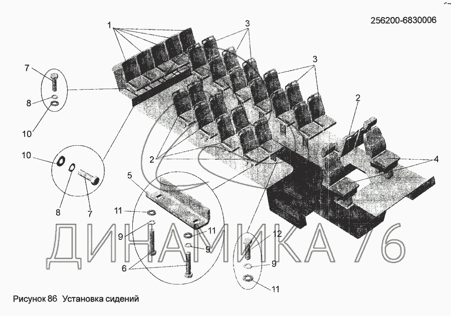 Перечень комплектующих от Установка сидений 256200-6830006 на МАЗ-256