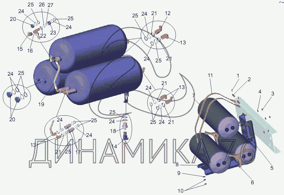 Перечень комплектующих от Крепление и присоединительная арматура ресиверов на МАЗ-256 (вариант)