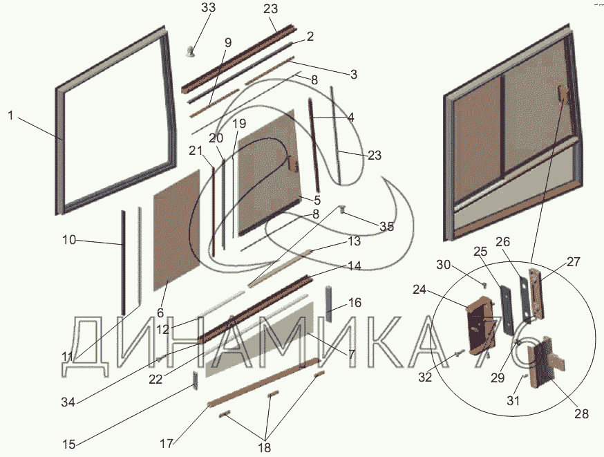 Перечень комплектующих от Окно двери водителя на МАЗ-256 (вариант)