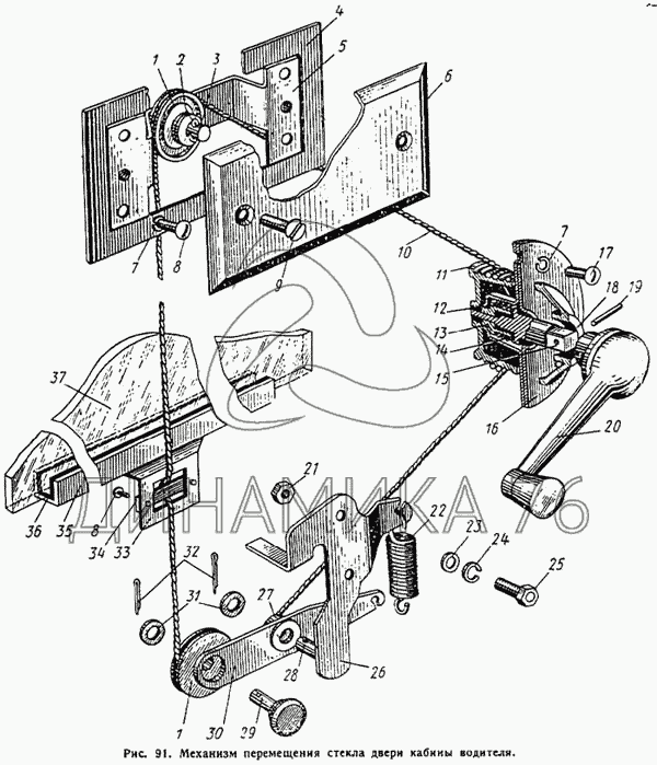 Механизм перемещения стекла двери кабины водителя — ЛиАЗ 677: