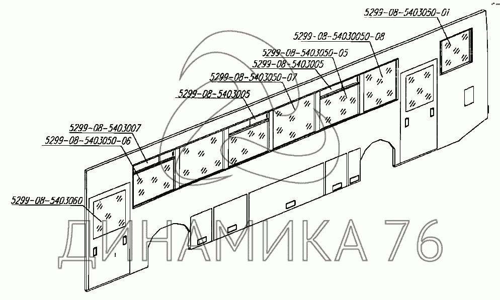 Схемы запчастей предназначены для справочных целей! Мы продаем не все запчасти от Установка окон правой боковины на 5299-08 (надстройка), представленные в этом списке.