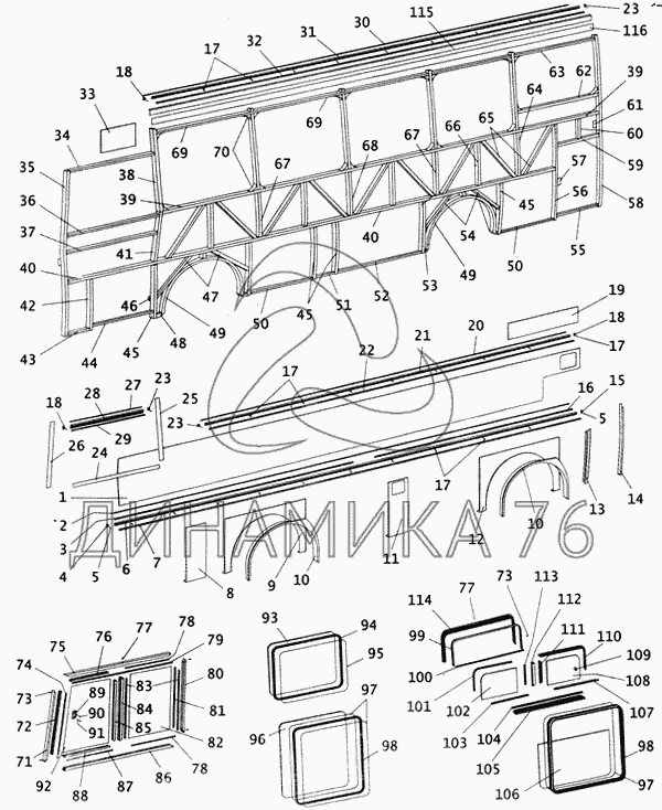 Схемы запчастей предназначены для справочных целей! Мы продаем не все запчасти от Боковина левая с остеклением на ПАЗ-4230, представленные в этом списке.