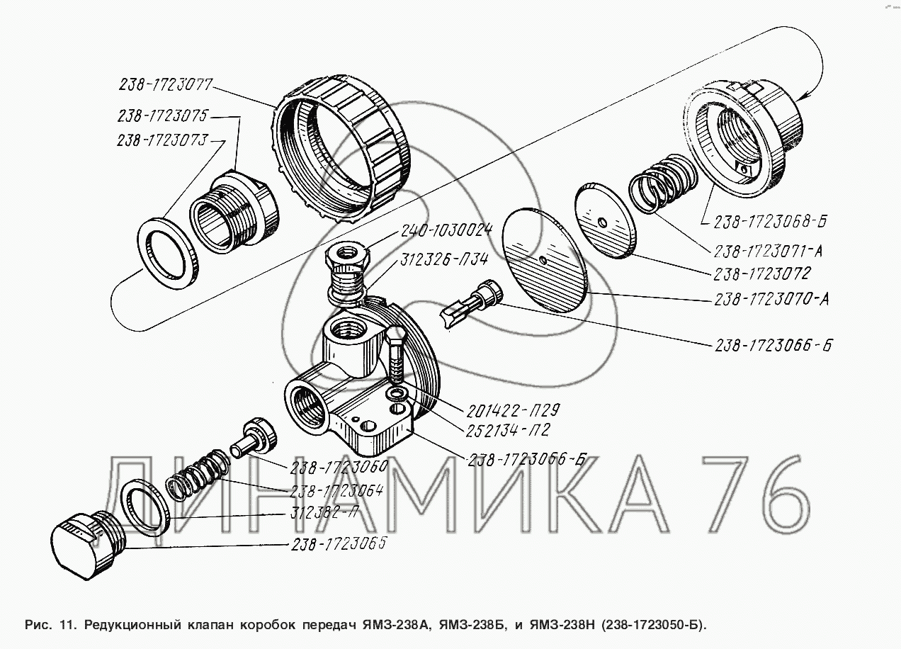 Перечень комплектующих от Редукционный клапан коробок передач ЯМЗ-238А, ЯМЗ-238Б, и ЯМЗ-238Н (238-1723050-Б) на ЯМЗ-238 Н