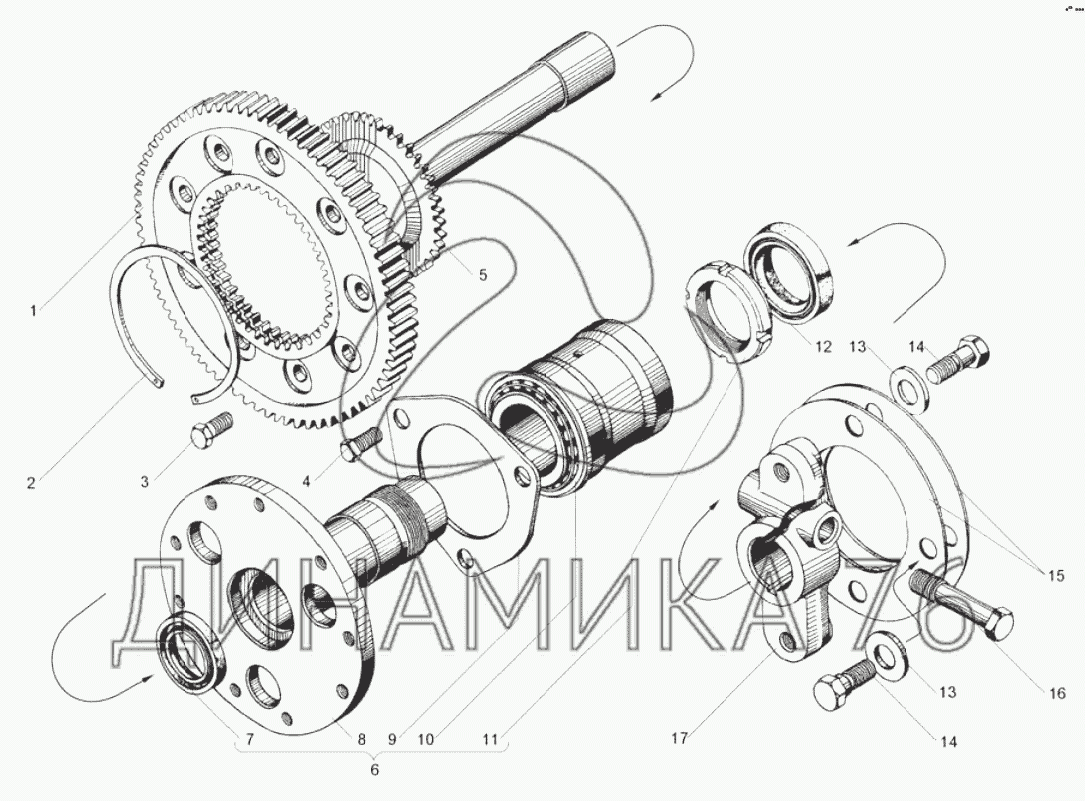 Ось ведомой шестерни с подшипником и маховиком в сборе