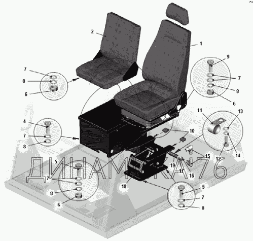 Схемы запчастей предназначены для справочных целей! Мы продаем не все запчасти от Установка сидений в кабине на БелАЗ-75306, представленные в этом списке.