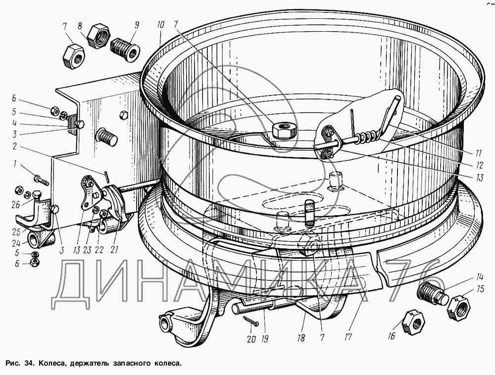 Перечень комплектующих от Колеса, держатель запасного колеса на ГАЗ-3307