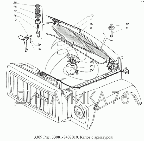 Схемы запчастей предназначены для справочных целей! Мы продаем не все запчасти от Капот с арматурой на ГАЗ-3309 (Евро 2), представленные в этом списке.