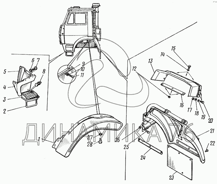 Перечень комплектующих от Крыло, брызговик и подножка на 43101