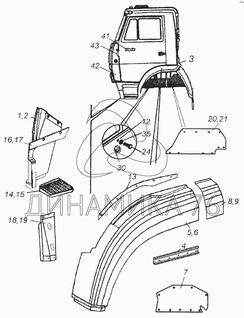 Перечень комплектующих от Крыло, брызговик и подножка на 6520
