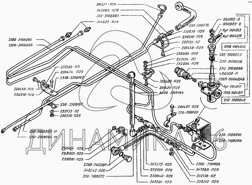 Схемы запчастей предназначены для справочных целей! Мы продаем не все запчасти от Трубопроводы гидроподъемника запасного колеса на КрАЗ-250, представленные в этом списке.