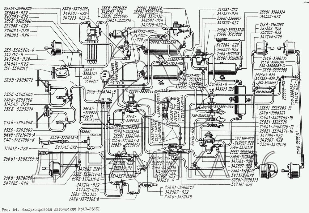 Перечень комплектующих от Воздухопроводы автомобиля КрАЗ-258Б1 на КрАЗ-256
