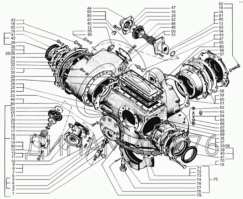 Редуктор главной передачи среднего моста (картер с крышками) — КрАЗ-65055-02:
