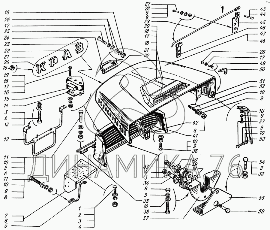 Схемы запчастей предназначены для справочных целей! Мы продаем не все запчасти от Облицовка радиатора и капот на КрАЗ-65055, представленные в этом списке.