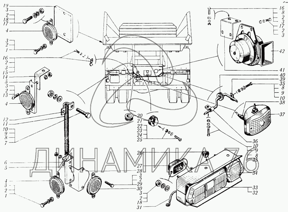 Перечень комплектующих от Установка задних световых приборов на КрАЗ-6510