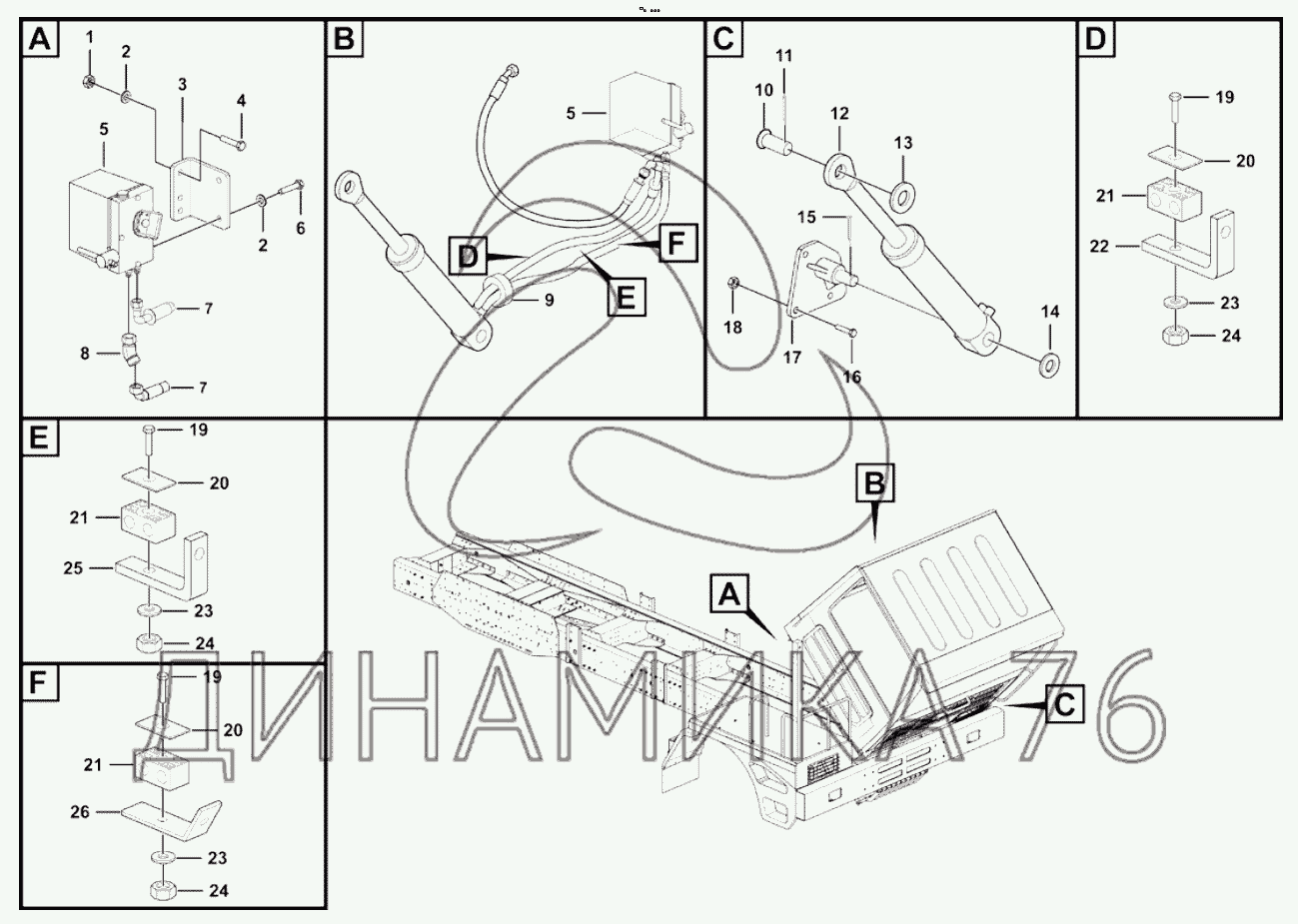 Перечень комплектующих от Cab fliping hydraulic assembly на MT76A
