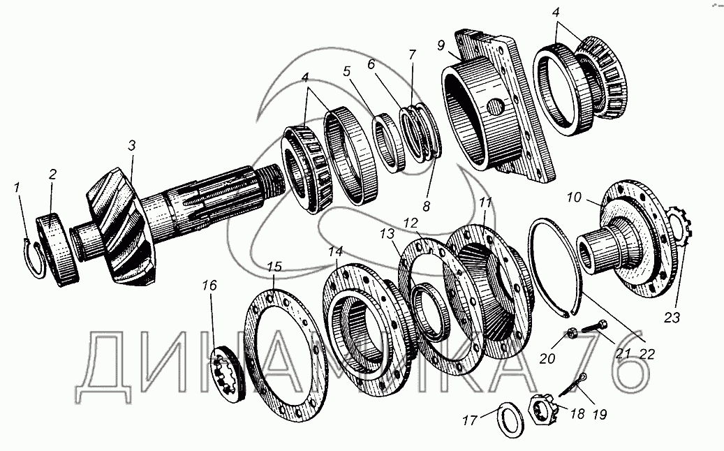 Шестерня ведущая спиральная с подшипником и картером подшипников в сборе