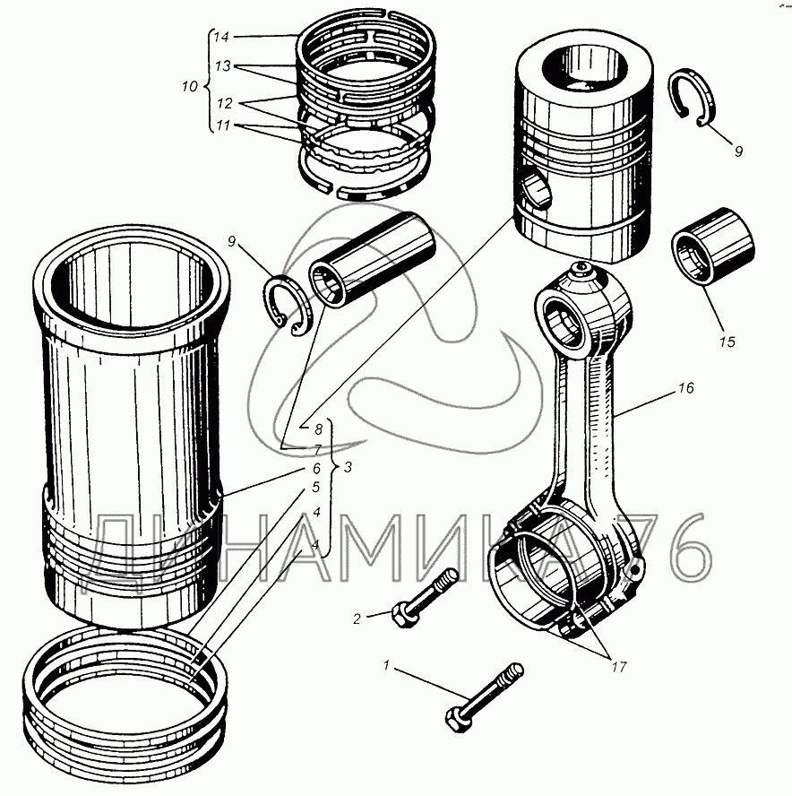 Перечень комплектующих от Поршень и шатун на МАЗ-504В