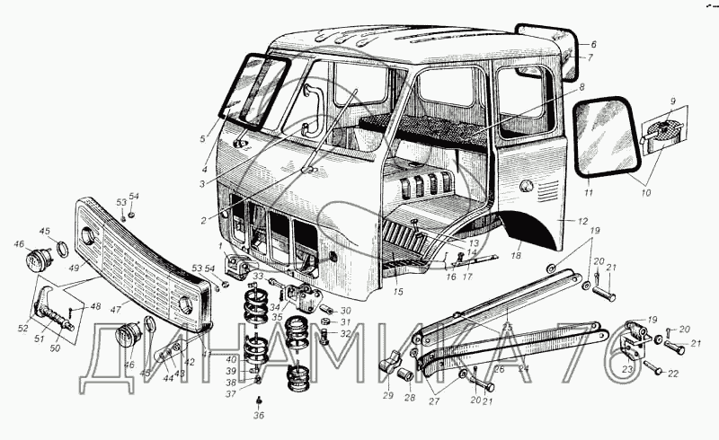 Перечень комплектующих от Каркас кабины и его крепление на МАЗ-5335