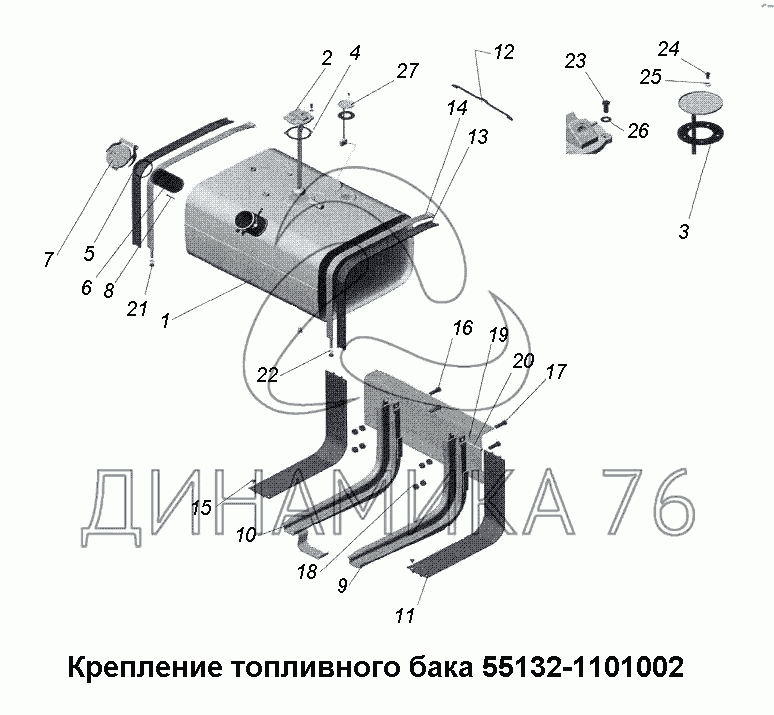 Схемы запчастей предназначены для справочных целей! Мы продаем не все запчасти от Крепление топливного бака 555132-1101002 на МАЗ-533731, представленные в этом списке.