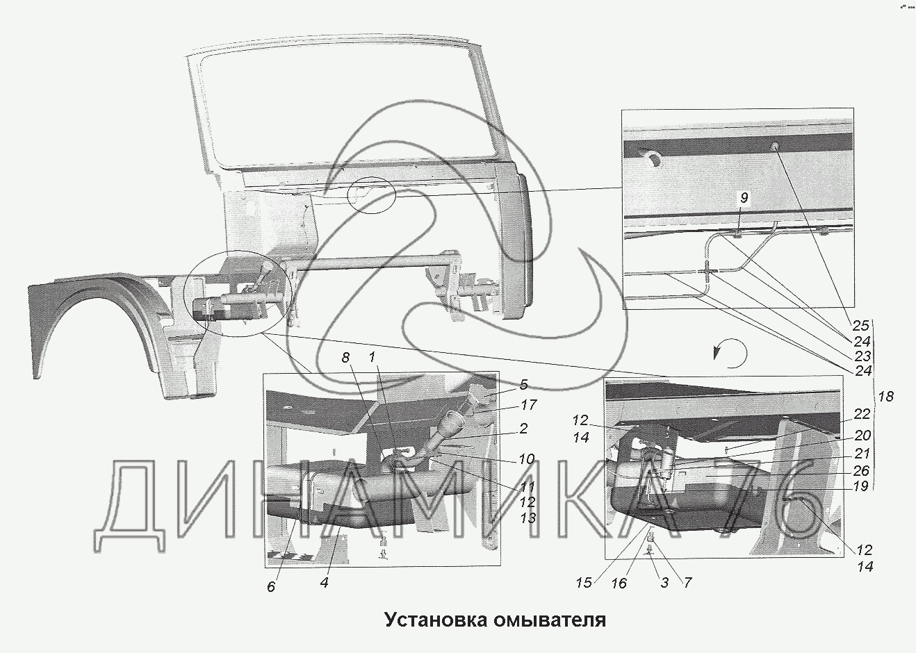 Перечень комплектующих от Установка омывателя на МАЗ-543403, 641705, 641708