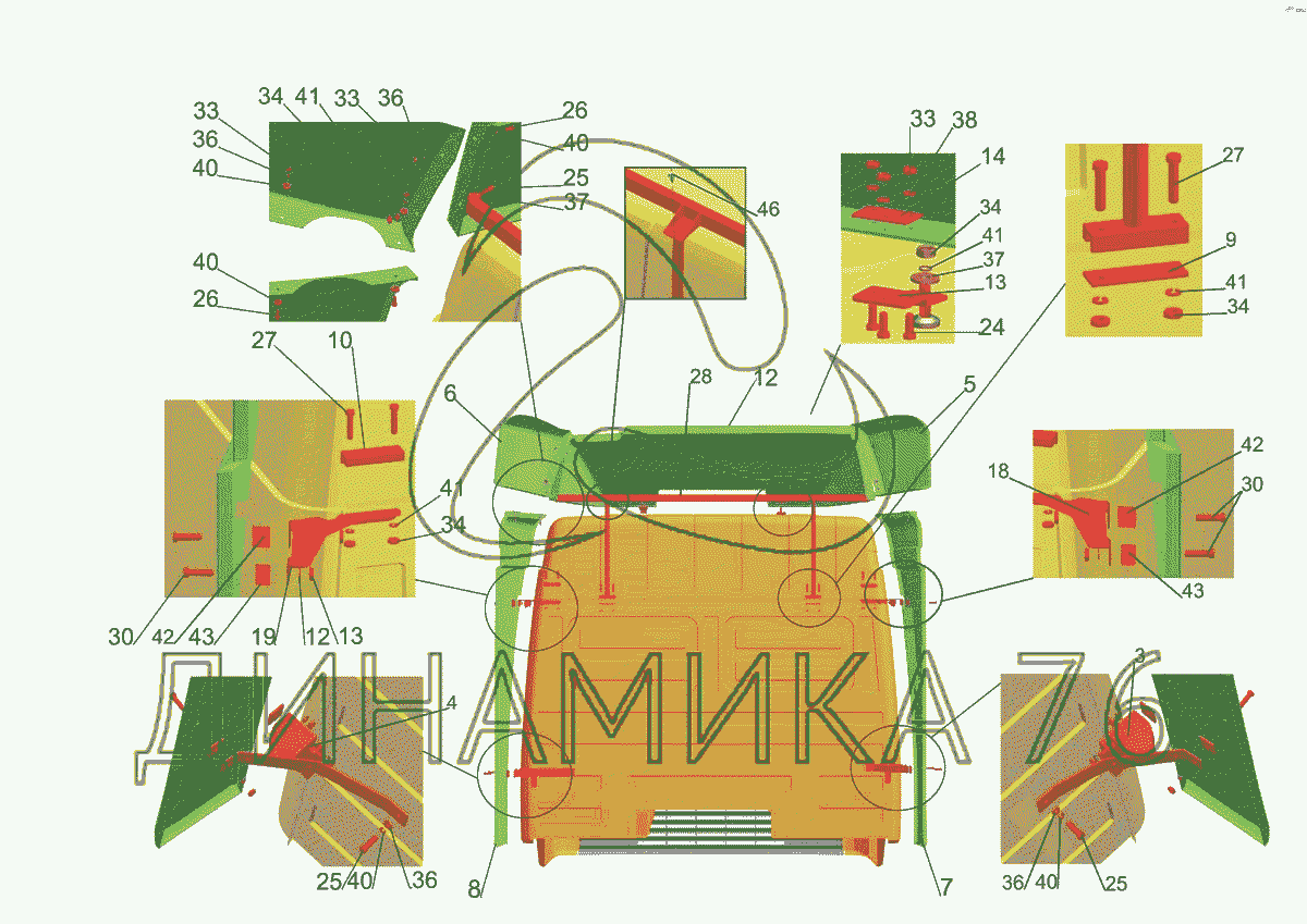 Схемы запчастей предназначены для справочных целей! Мы продаем не все запчасти от Установка обтекателей 6430-8000014-010 на МАЗ-5440E9, представленные в этом списке.
