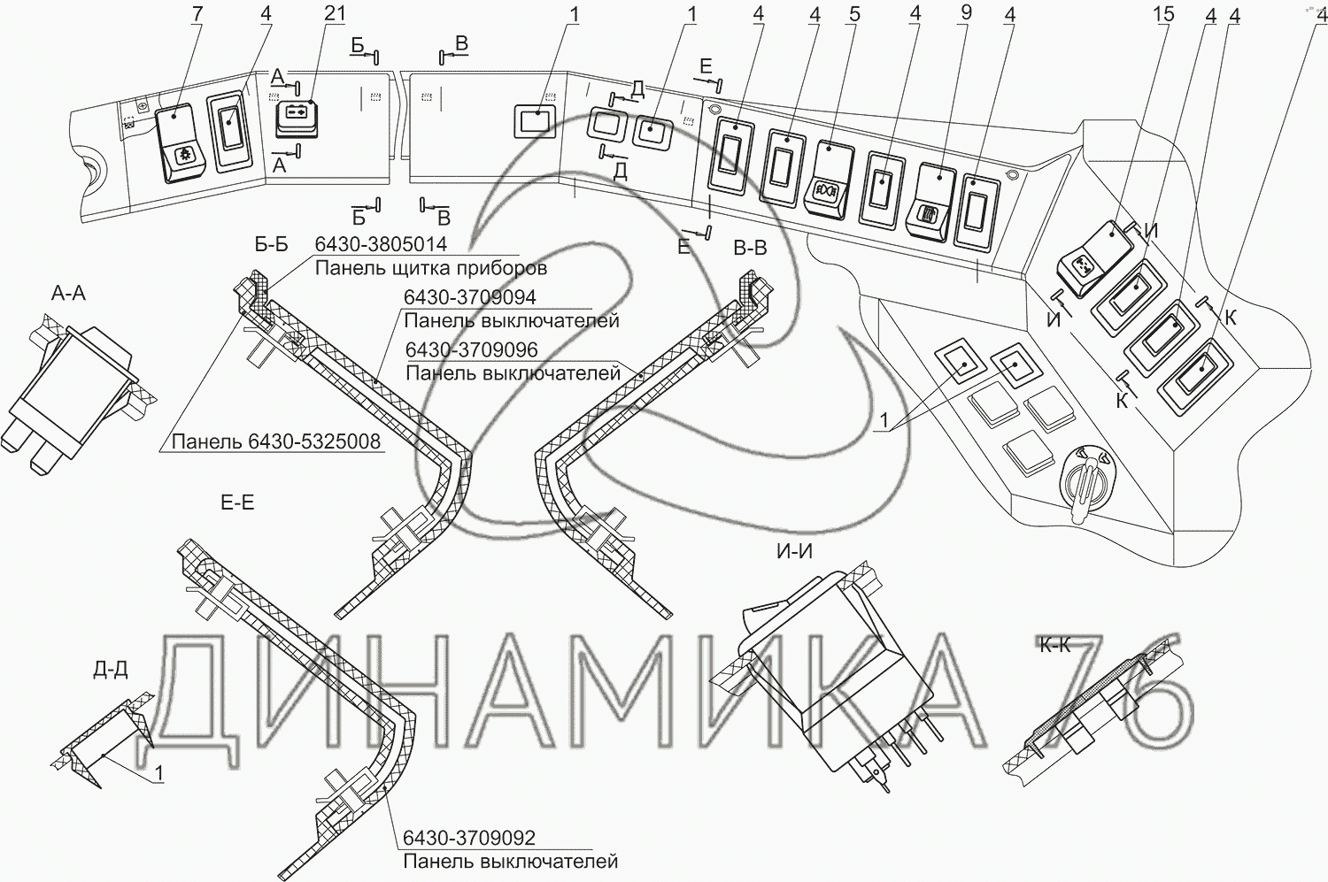 Перечень комплектующих от Установка выключателей 555035-3700018 на МАЗ-5550V3 (V5)