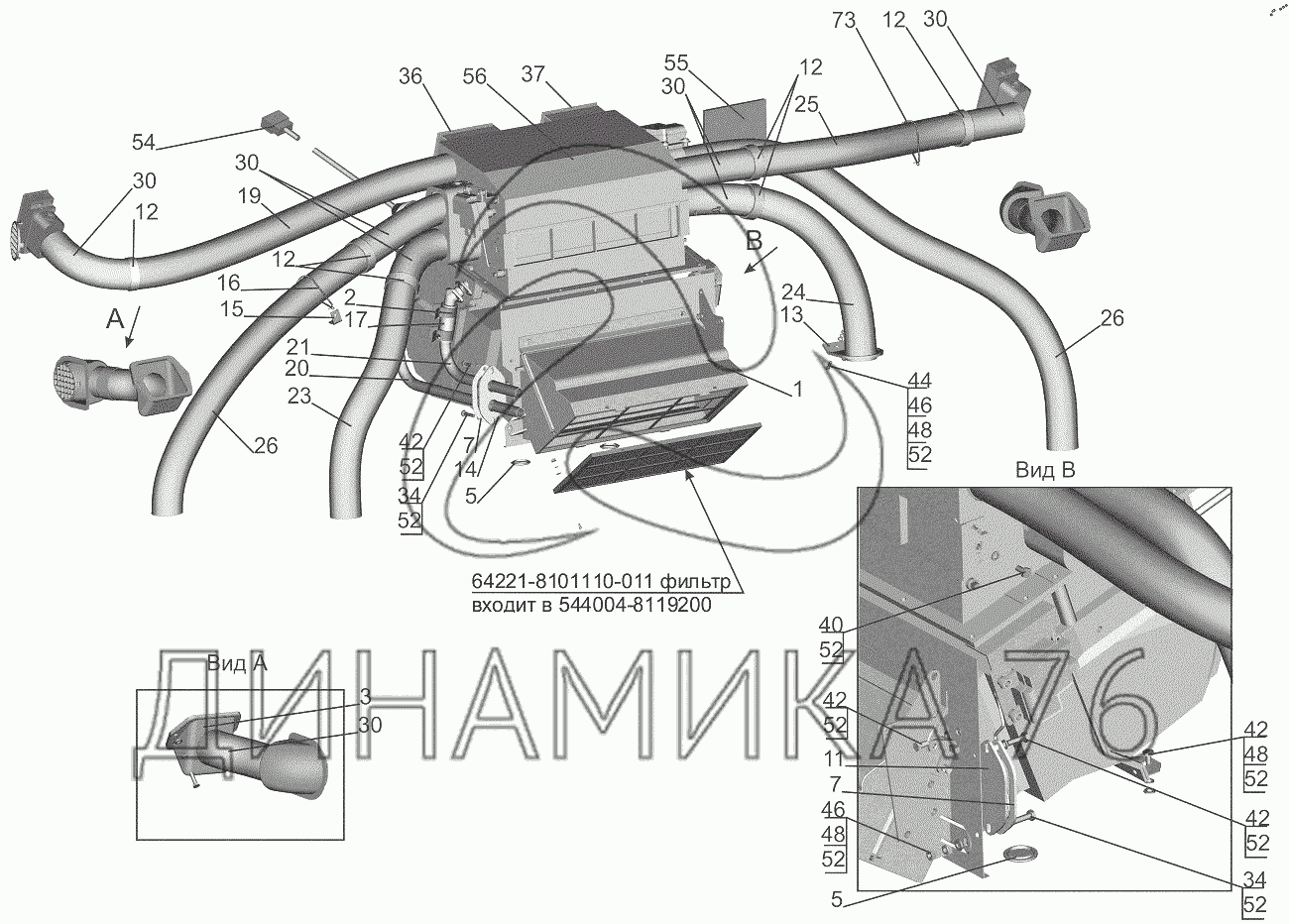 Схемы запчастей предназначены для справочных целей! Мы продаем не все запчасти от Установка отопителя 631019-8100001 на МАЗ-6501B9, представленные в этом списке.