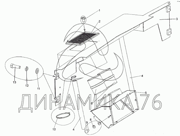 Перечень комплектующих от Установка воздухозаборника отопителя на МЗКТ-74171