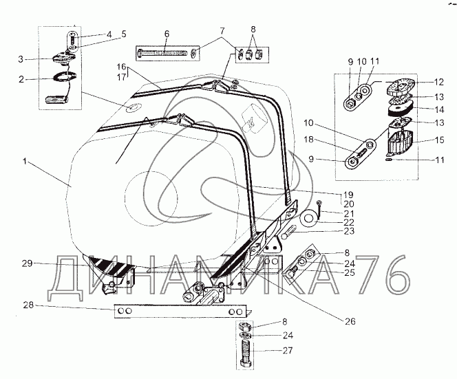 Схемы запчастей предназначены для справочных целей! Мы продаем не все запчасти от Установка переднего топливного бака на МЗКТ-74296, представленные в этом списке.