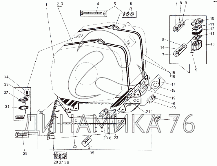 Схемы запчастей предназначены для справочных целей! Мы продаем не все запчасти от Установка топливного бака на МЗКТ-74296, представленные в этом списке.