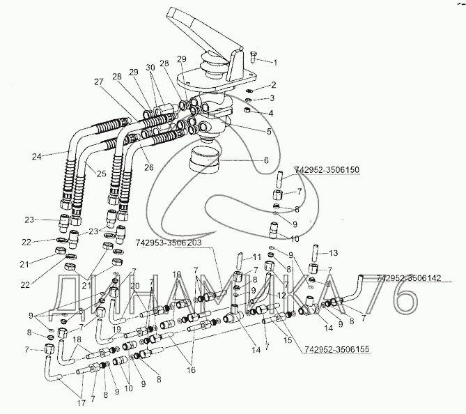 Схемы запчастей предназначены для справочных целей! Мы продаем не все запчасти от Установка тормозного крана на МЗКТ-74296, представленные в этом списке.
