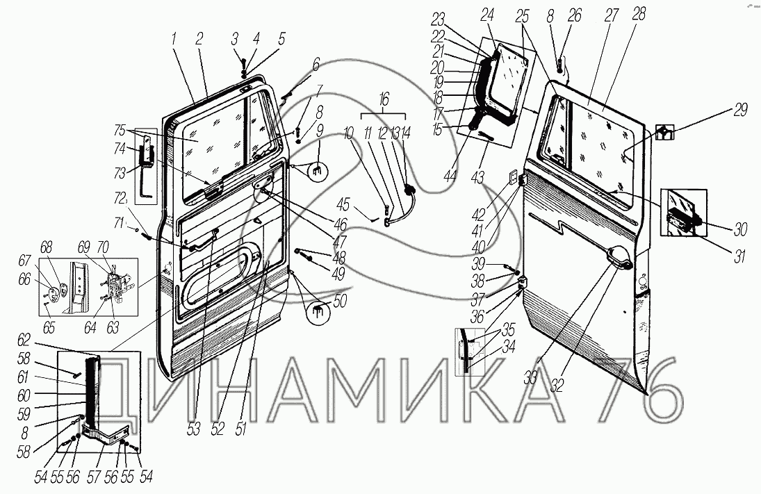 Перечень комплектующих от Двери кабины на УРАЛ-43204-1111-70