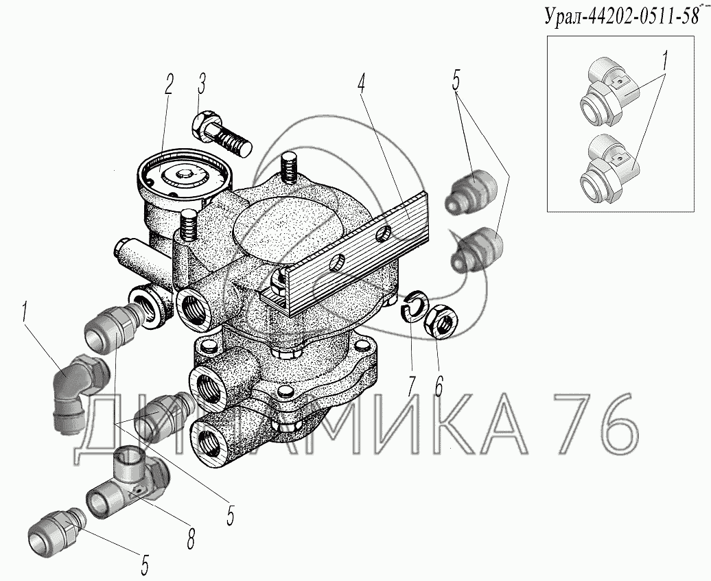 Схемы запчастей предназначены для справочных целей! Мы продаем не все запчасти от Установка клапана прицепа на УРАЛ-4320-0971-58, представленные в этом списке.