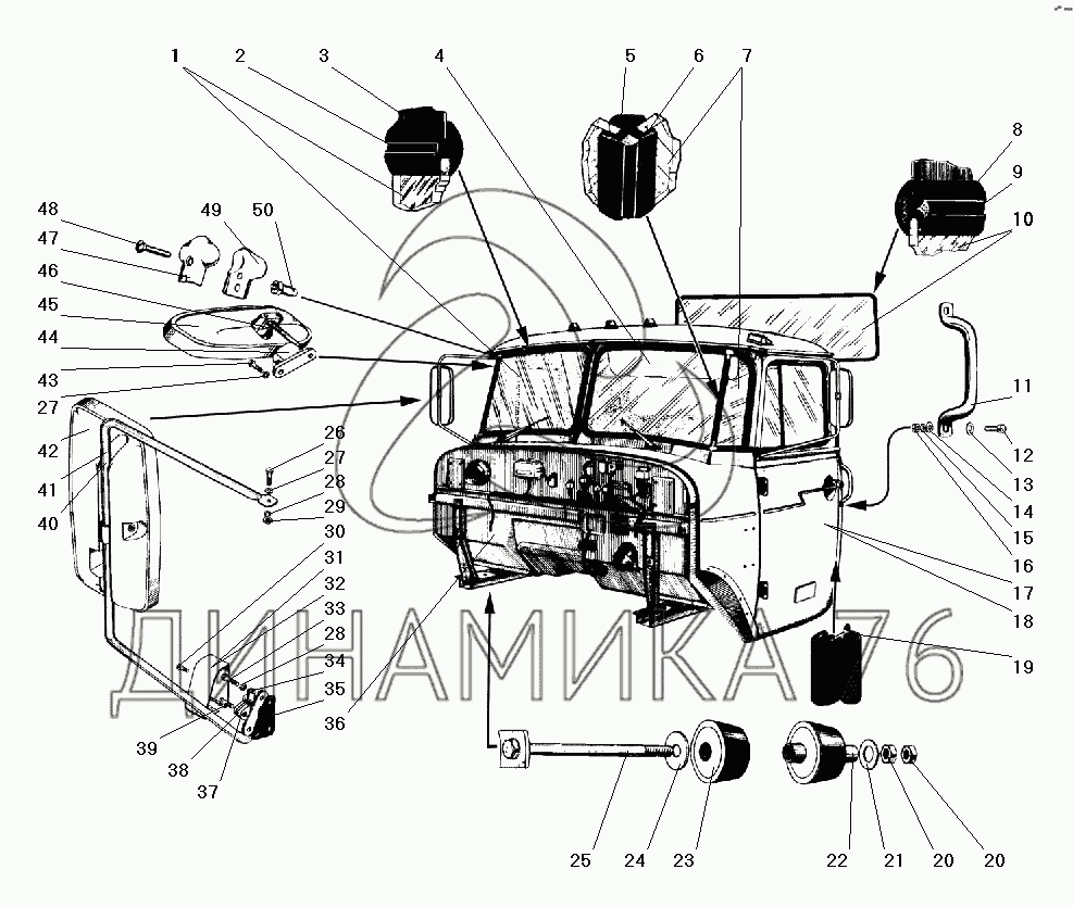 Перечень комплектующих от Кабина в сборе на УРАЛ-5557-40