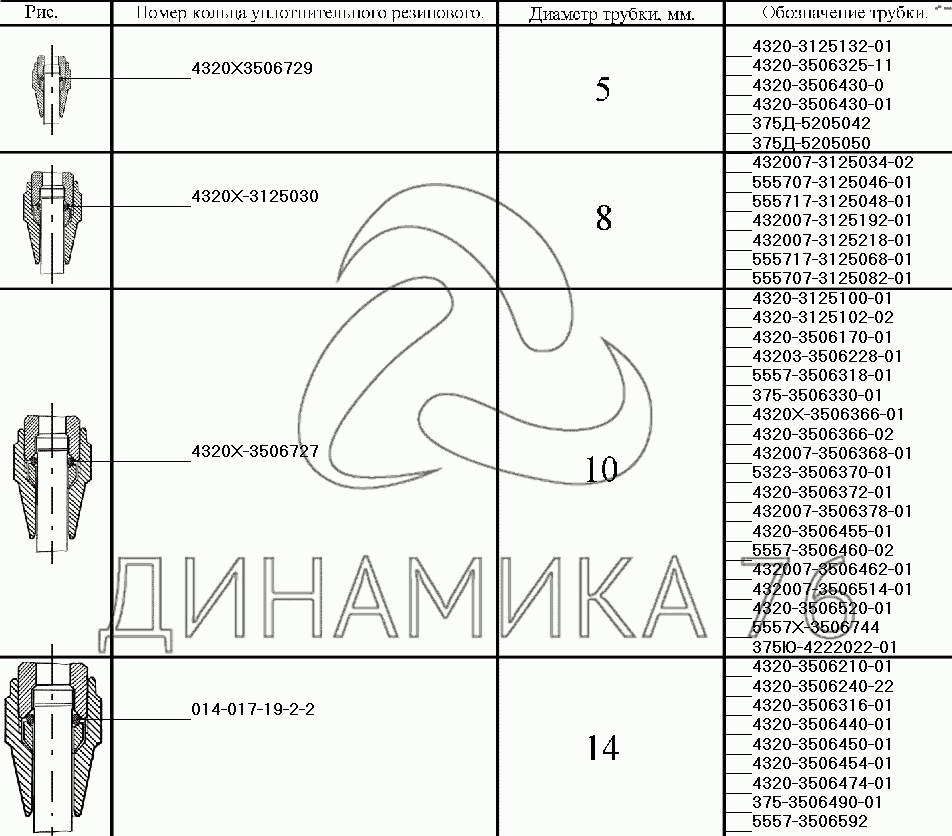 Перечень комплектующих от Уплотнение трубопроводов на УРАЛ-5557-40