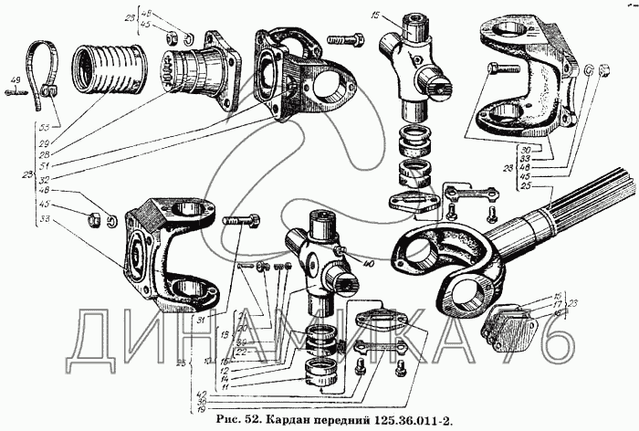 Схемы запчастей предназначены для справочных целей! Мы продаем не все запчасти от Кардан передний 125.36.011-2 на Т-150К, представленные в этом списке.