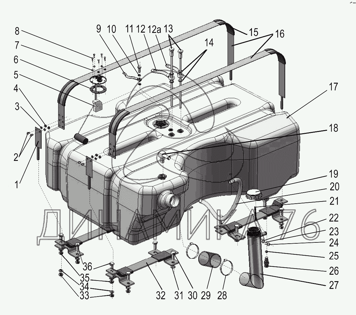 Перечень комплектующих от Бак топливный (в комплектации трактора с гидроподъемником) на 1025/1025.2/1025.3