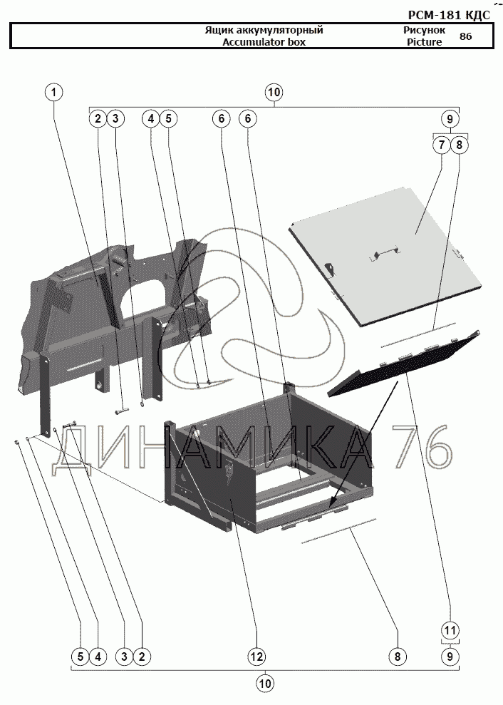 Схемы запчастей предназначены для справочных целей! Мы продаем не все запчасти от Ящик аккумуляторный на РСМ-181 "Torum-740", представленные в этом списке.