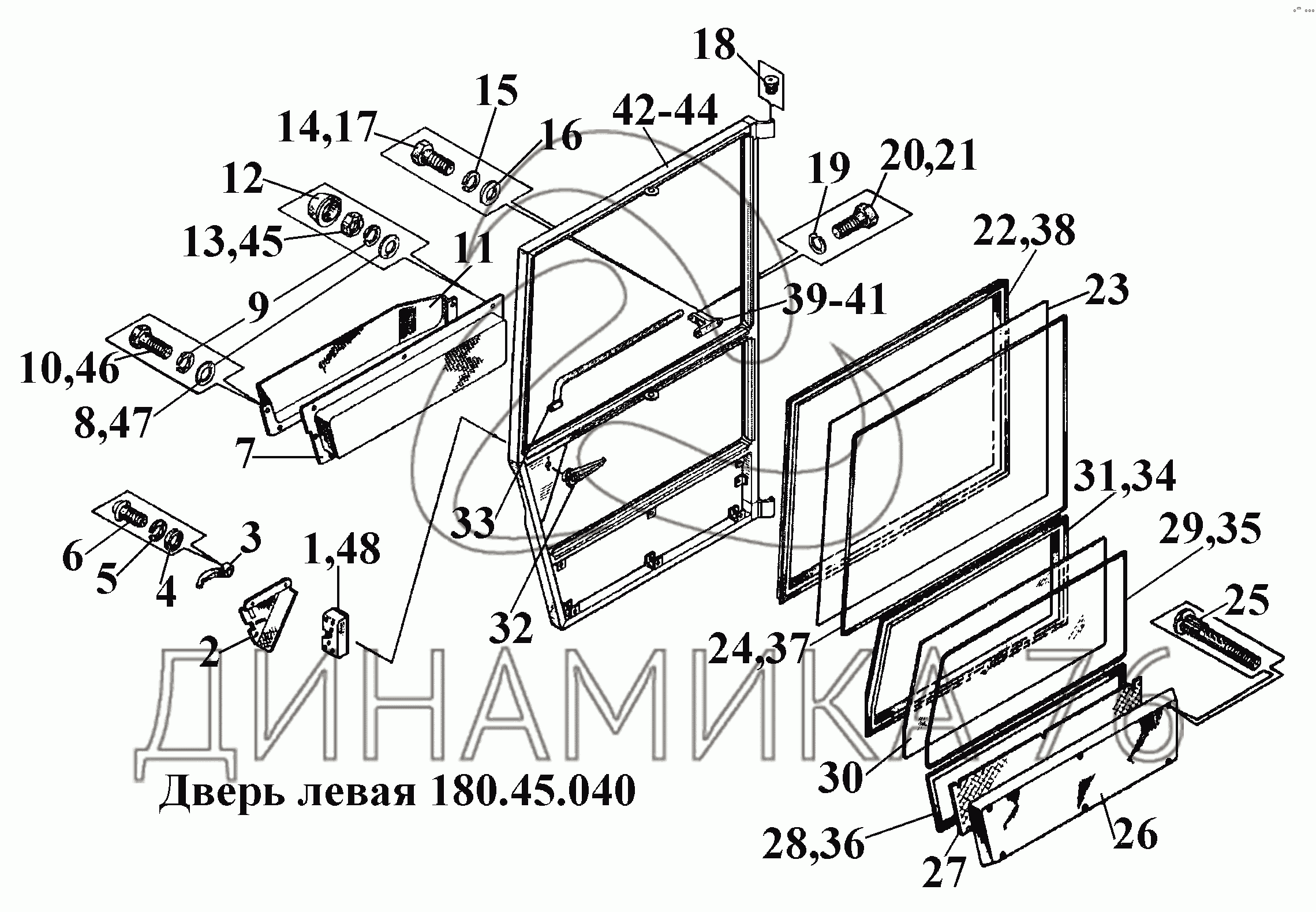 Схемы запчастей предназначены для справочных целей! Мы продаем не все запчасти от Дверь левая 180.45.040 на ВТ-100Д, представленные в этом списке.