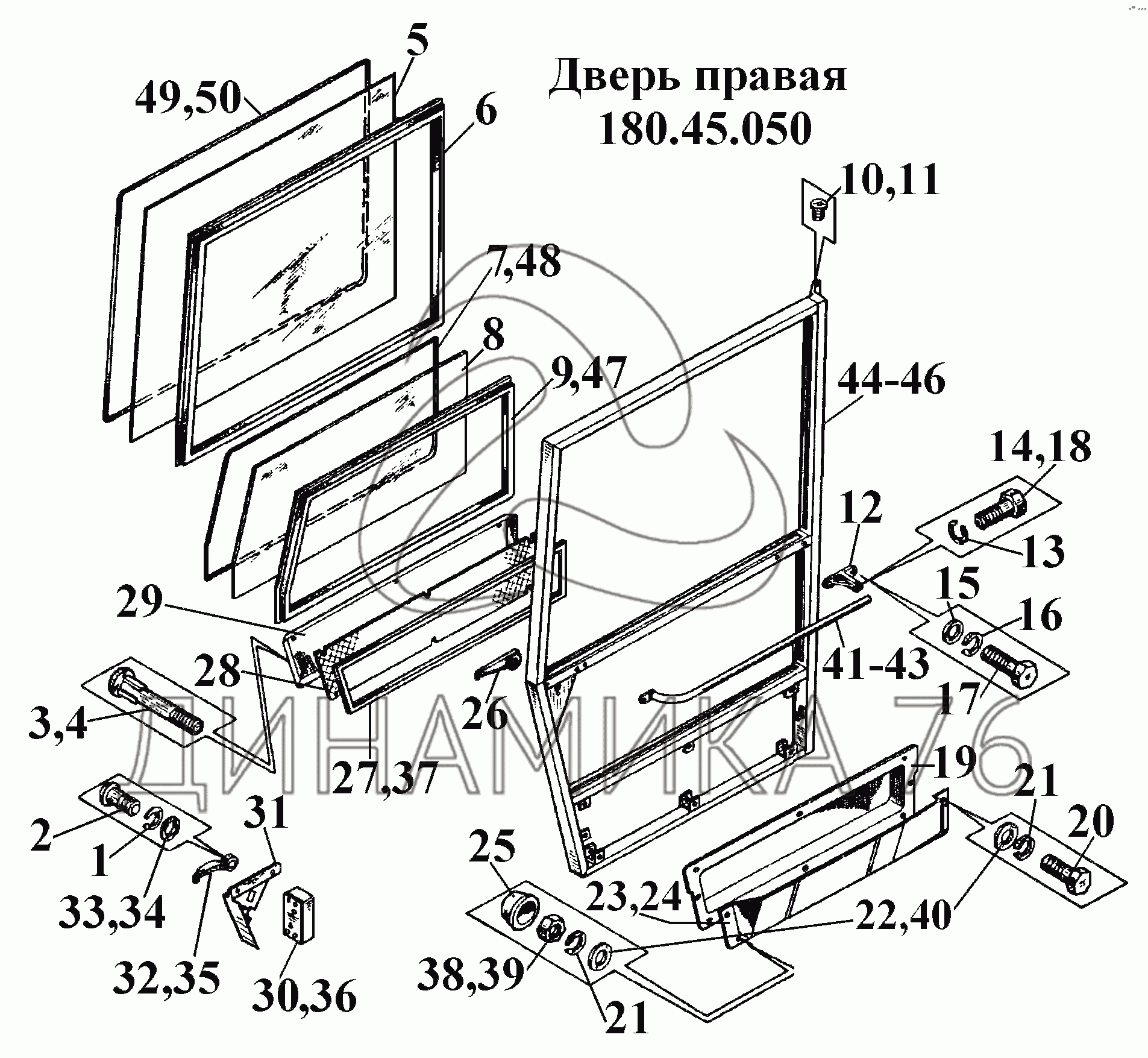 Перечень комплектующих от Дверь правая 180.45.050 на ВТ-100Д