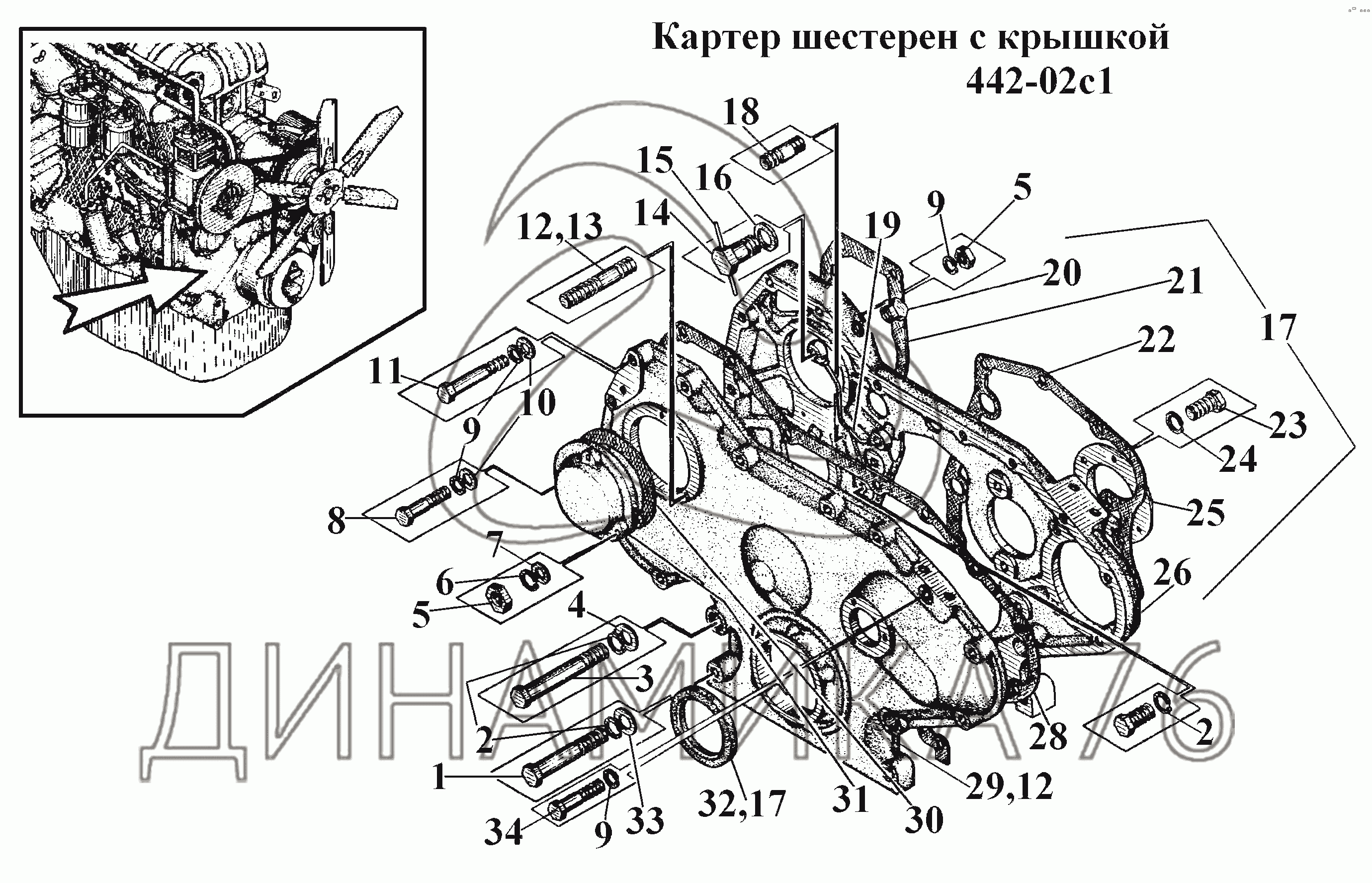 Перечень комплектующих от Картер шестерен с крышкой 442-02с1 на ВТ-100Д